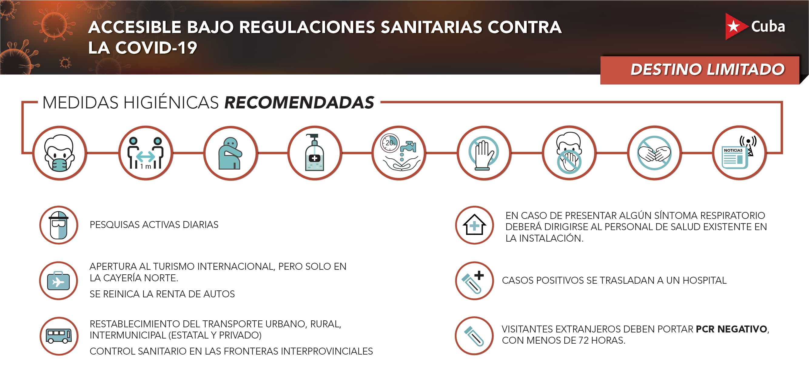 Debe portar a su llegada al país, un PCR negativo con 72 hrs antes de su viaje, realizado por un laboratorio certificado , el resultado de un segundo PCR, ejecutado por las autoridades sanitarias cubanas y la Declaración de Sanidad del Viajero (Modelo 82-32), como declaración jurada de tu estado de salud y luego cumplir el aislamiento establecido.